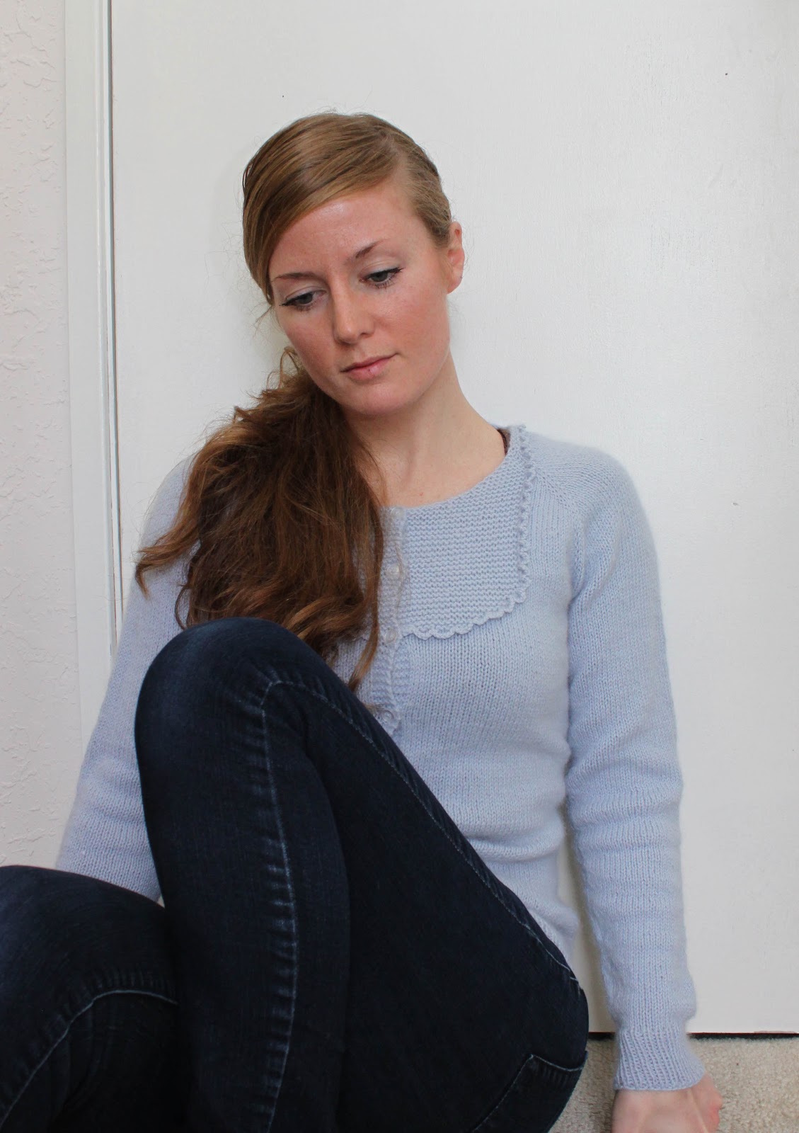 The book was to be divided into three catagories; Farm Hands, Ivy League, and Southern Comfort, all of which were equally appealing. In the end I decided to go with a sketch for Southern Comfort. I envisioned a light cardigan knit in a luxurious yarn, something with a bit of a halo. I wanted the garment to look classic and a little vintage, my drawing featured a bib style front by working garter stitch on the yoke to mirror the neckline. Bordering the garter stitch bib is a simple crochet scalloped edge that really polishes the look and adds the feminine touch I was going for.